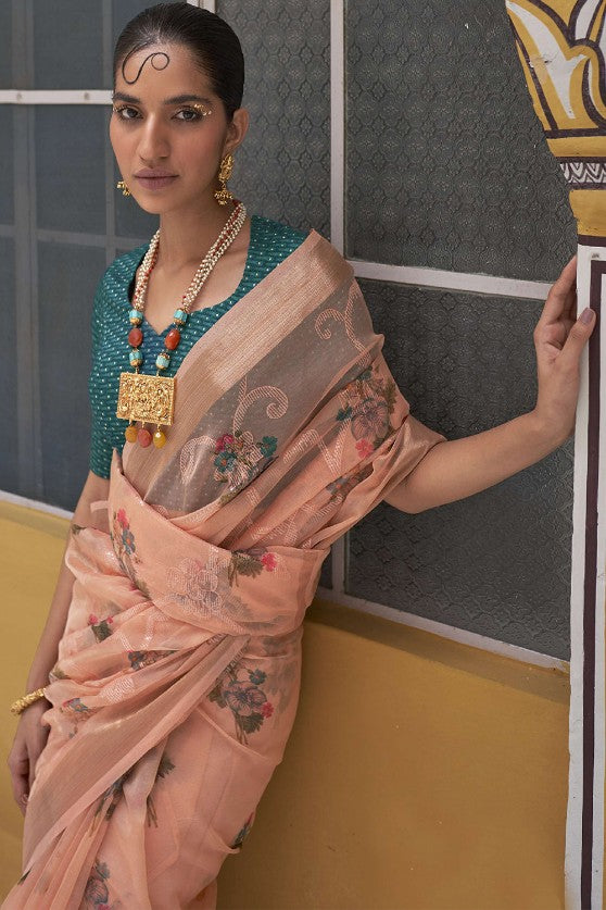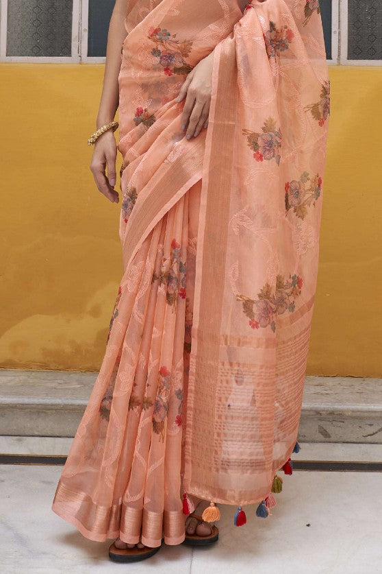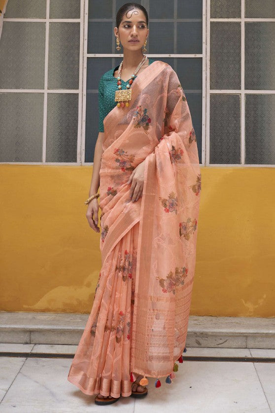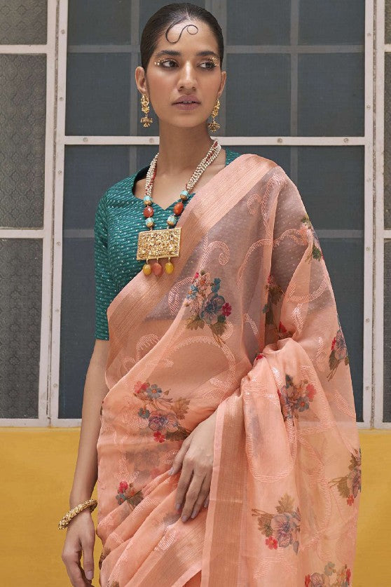 Cantaloupe Oramge Digital Print SeaquinsTissue Silk Saree